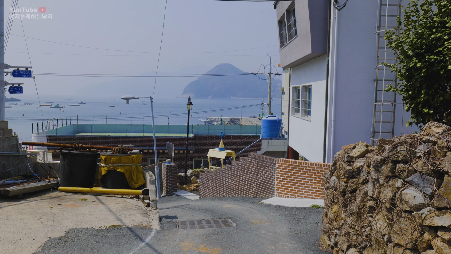 산길이 끝나고 언덕 아래를 내려다보니 선착장과 함께 예구마을이 내려다보입니다.