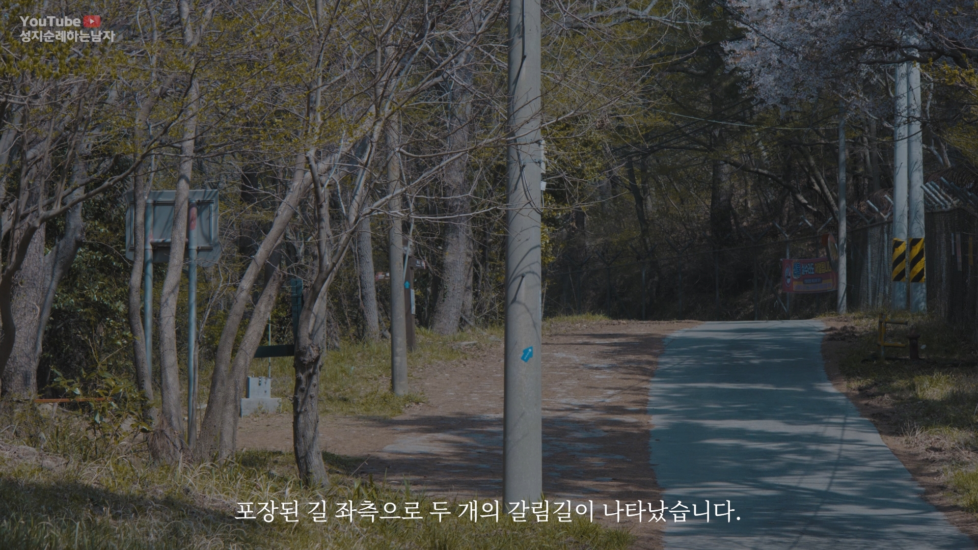 포장된 길 좌측으로 두 개의 갈림길이 나타났습니다.
